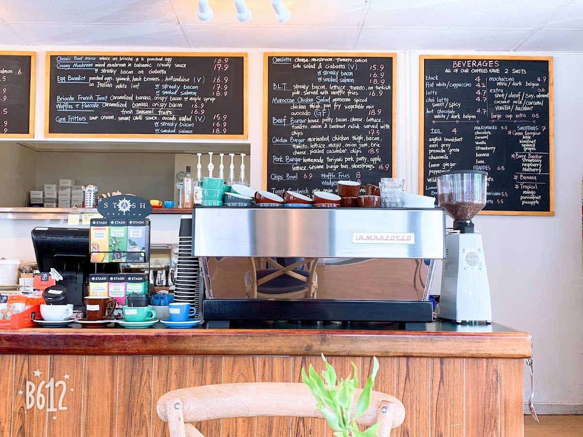 The menu includes speciality coffee drinks such as flat whites and mochaccinos. Light meals and breakfast items feature dishes like eggs rosti with salmon and Moroccan chicken salad. For those looking for lighter options or snacks, there are salads and fruit waffles available. Additionally, a selection of cakes and desserts is offered to complement the coffee choices.